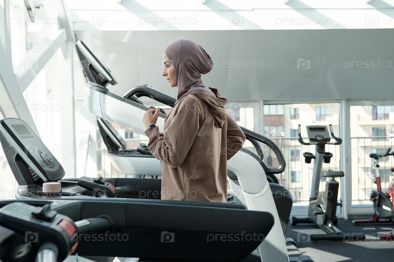 Молодая активная женщина в хиджабе и спортивной одежде, бегущая на беговой дорожке