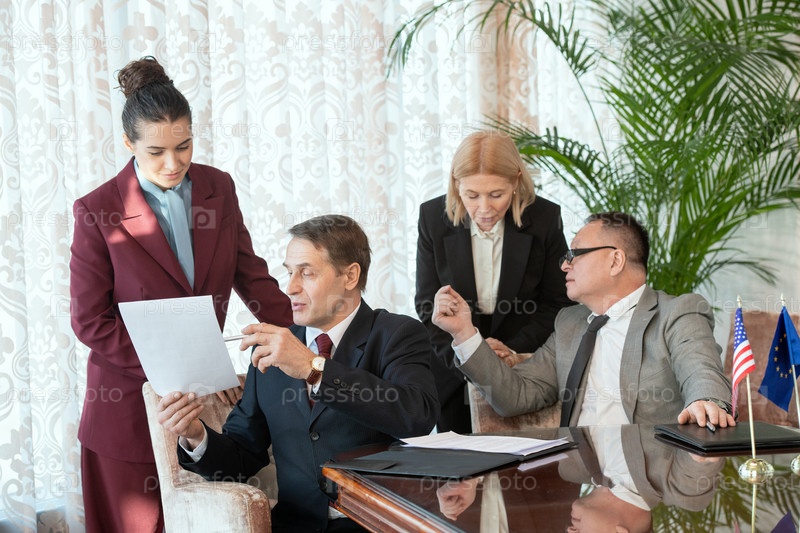 Два делегата в формальной одежде консультируются с секретаршами во время чтения контракта