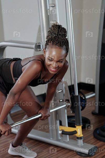Спортсменка, устанавливающая штангу в машине для тренажеров