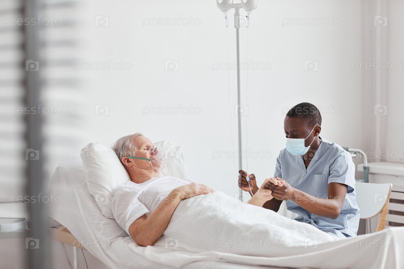 Медсестра устанавливает IV капли мужчина