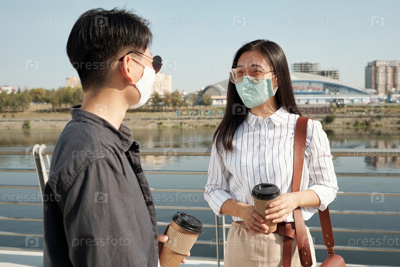 Два молодых сотрудника в масках, взаимодействующие на берегу реки