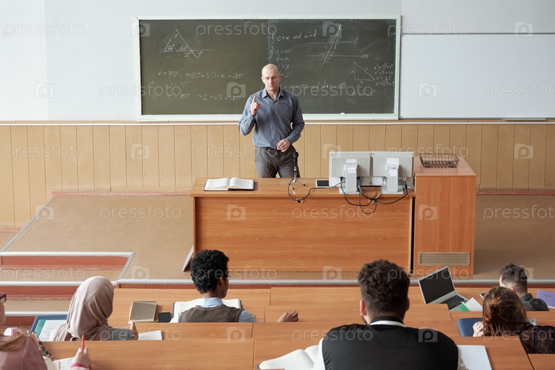 лысый зрелый профессор стоит за столом перед аудиторией и объясняет тему лекции