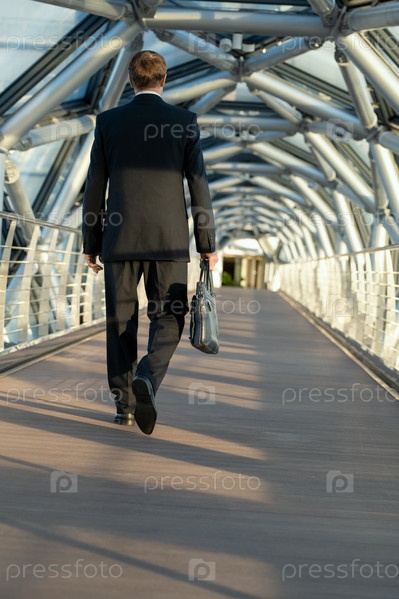 Мужчина с черной кожаной сумочкой, идущий по длинному тротуару