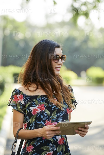 Улыбающаяся женщина ith цифровой планшет i