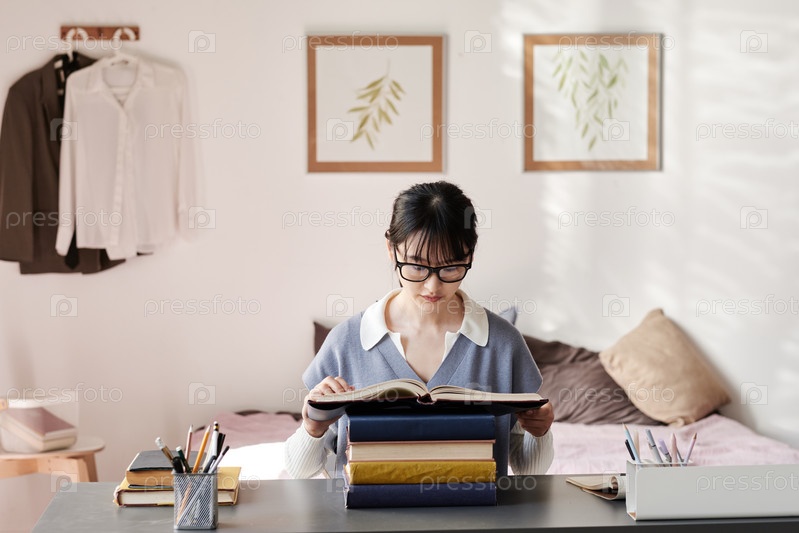 Концентрированная азиатская студентка в очках сидит за столом и читает учебник перед экзаменом в комнате