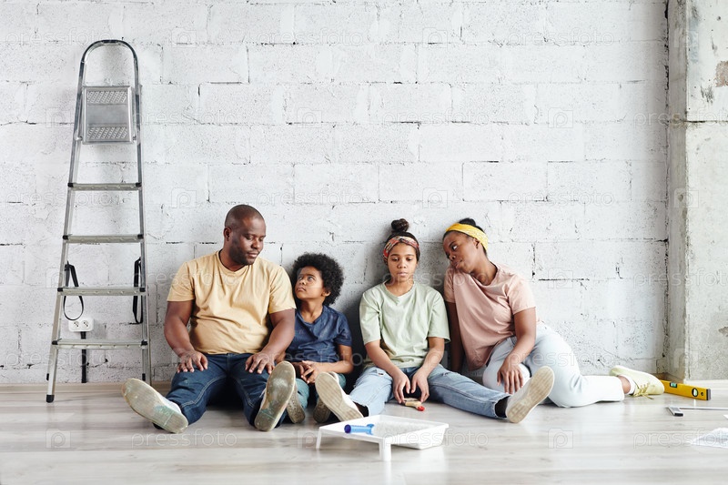 Усталая африканская семья отца, матери, маленького сына и дочки-подростка сидят на полу