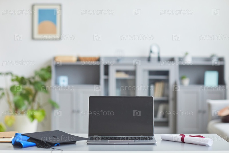 Ноутбук на столе с выпускной шляпой
