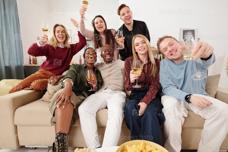 Группа молодых веселых межкультурных друзей в умной повседневной одежде, сидящих на диване