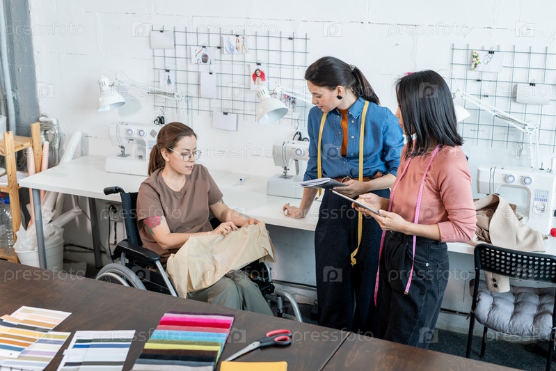 Две молодые женщины-модные дизайнеры консультируются с Seamtsress в инвалидном кресле о качестве текстиля