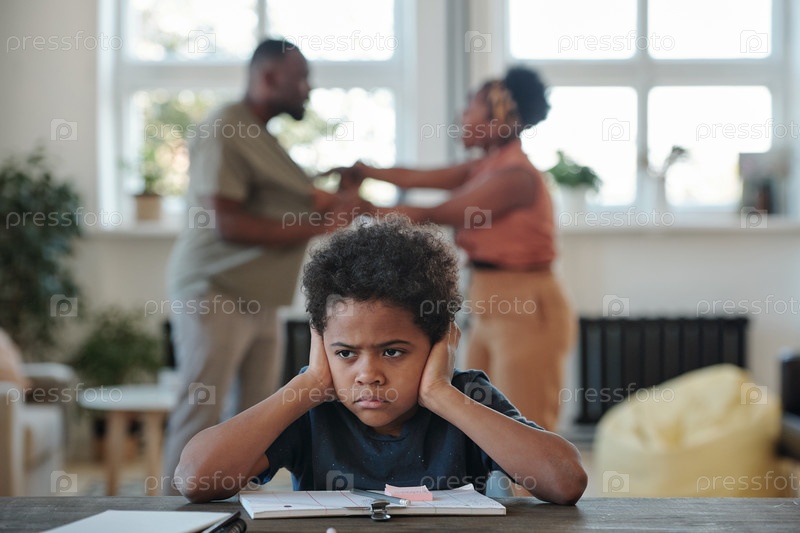 Разгневанный маленький мальчик африканской этнической принадлежности, прикрывающий уши руками, пытаясь сделать домашнее задание