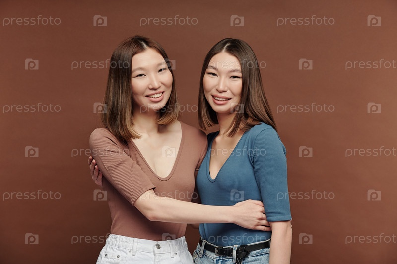Молодые веселые и ласковые сестры-близнецы в пуловерах, стоящие обнимаясь