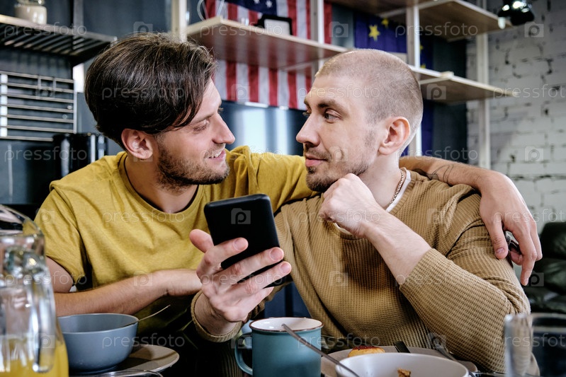 Молодой мужчина обнимает своего парня во время разговора