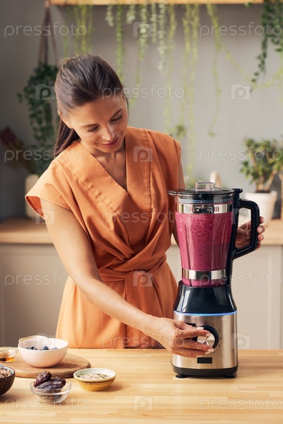 Красивая женщина с блендером готовит фруктовый смузи