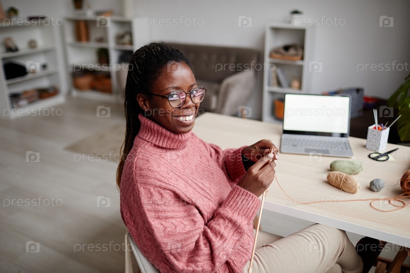 Улыбающаяся афроамериканская женщина вяжет дома