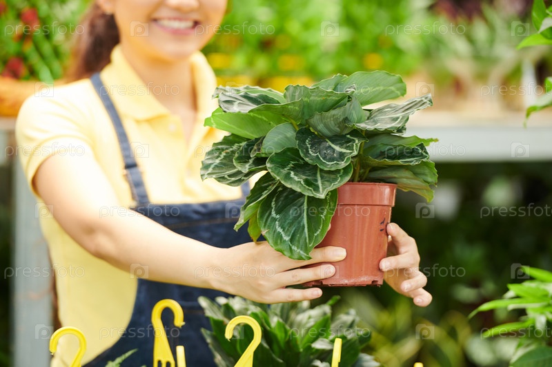 Тепличный рабочий предлагает цветок