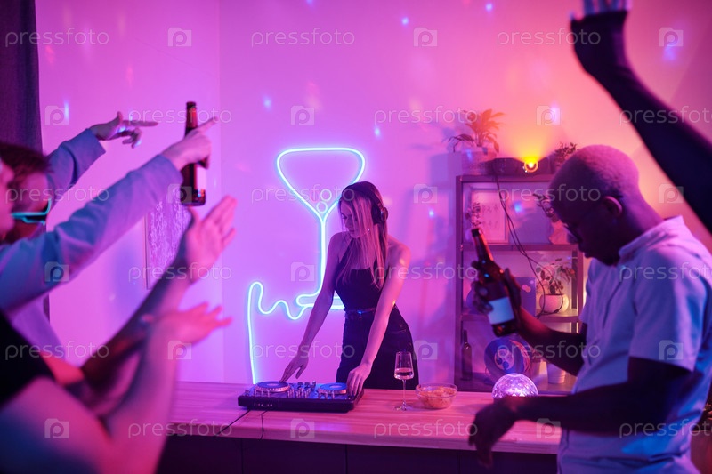 Красивая девушка с длинными светлыми волосами, смешивающая музыку за стойкой с проигрывателями