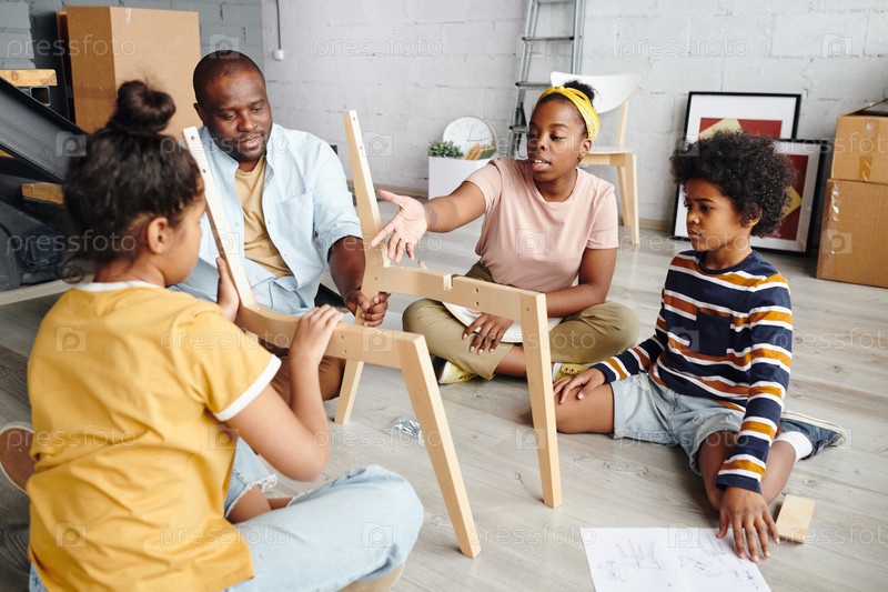 Молодая африканская семья собирается собрать деревянный стул, сидя на полу большой гостиной