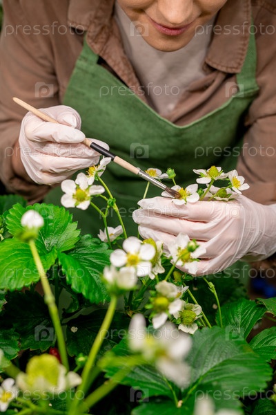 Человек, держащий цветок клубники во время опыления