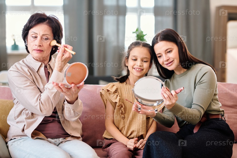 Три женщины делают макияж, сидя на диване