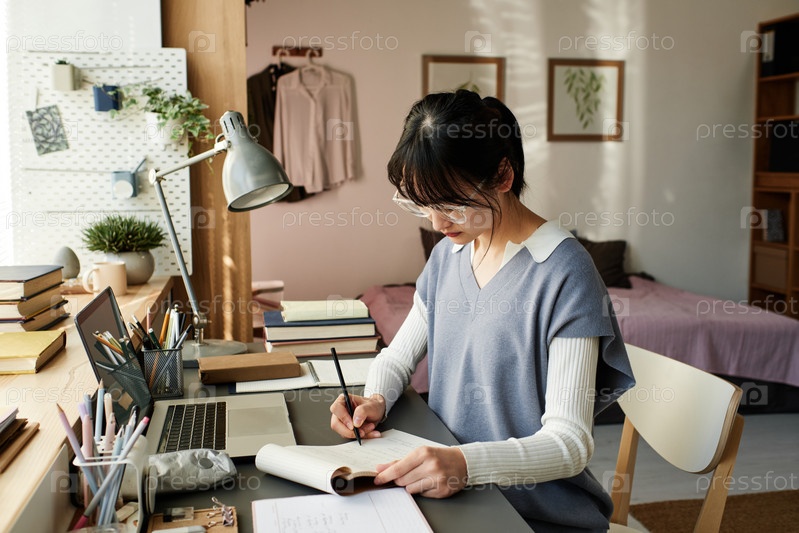 Серьезная азиатская девушка в очках сидит за столом и готовится к семинару в комнате кампуса