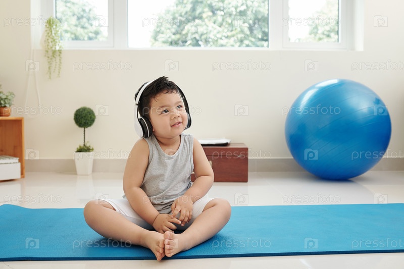 Улыбающийся ребенок слушает музыку