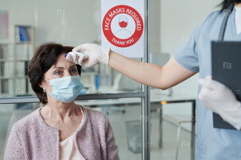 В перчатках медсестра измеряет температуру тела зрелой женщины в защитной маске