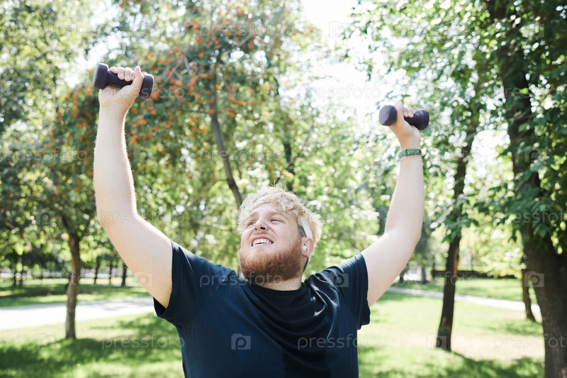Мужчина занимается упражнениями с гантеликами на открытом воздухе