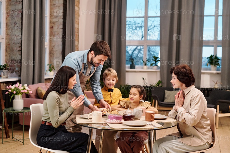 Веселый молодой человек кладет тарелку с печеньями на подаваемый стол с тортом и чаем