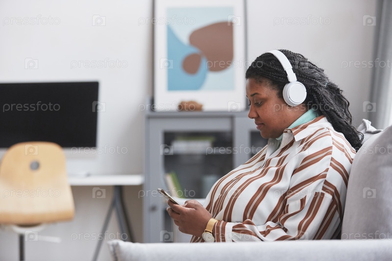 Избыточный вес афроамериканская женщина, носящая наушники Side View