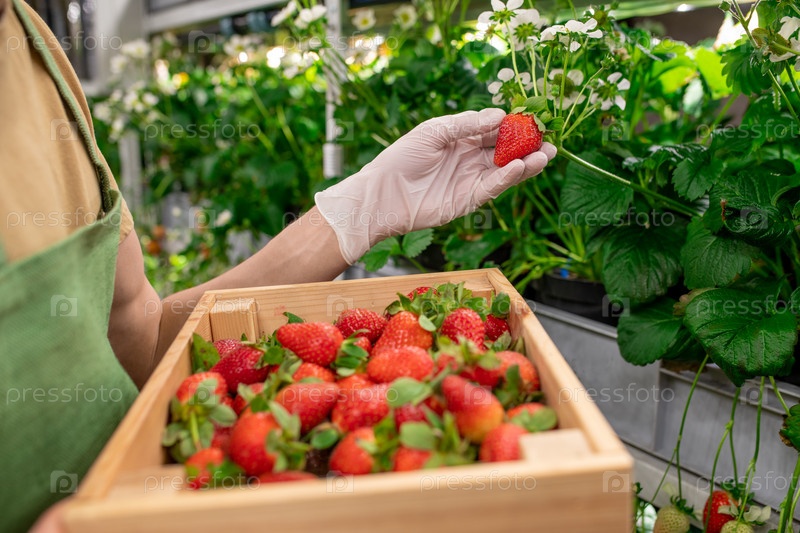 Человек с коробкой клубники подбирает еще одну спелую ягоду