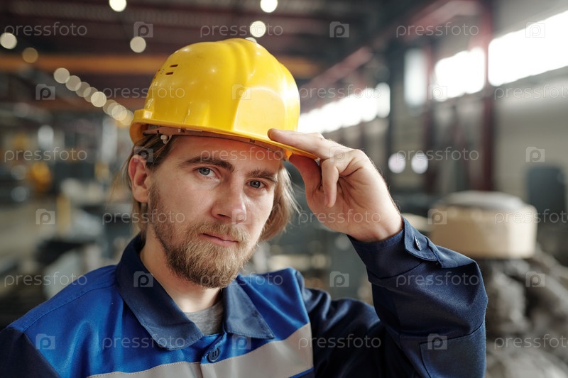 Молодой серьезный инженер-мужчина или фабричный работник в желтой шляпе смотрят на вас в большой мастерской