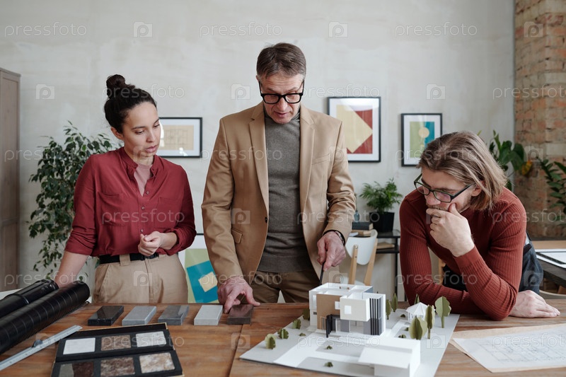 Молодые архитекторы окружают зрелого коллегу-мужчину во время выбора деталей для модели нового дома