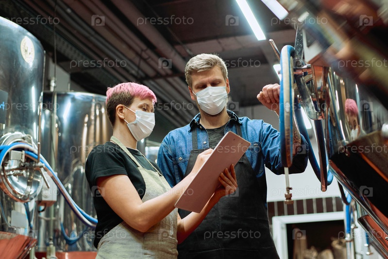 Два молодых пивовара большой современной фабрики по производству пива обсуждают записи