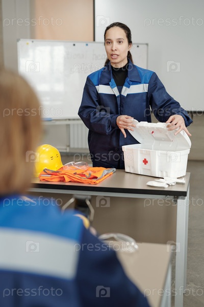 Уверенная женщина в рабочей одежде открывает коробку с медицинскими вещами во время урока безопасности жизни