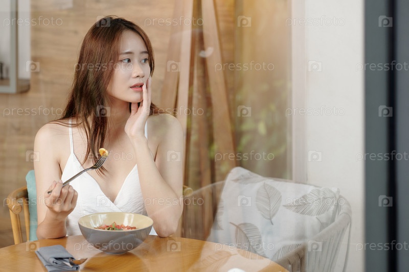 Женщина ест фруктовый салат