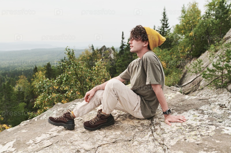 Мечтательный молодой турист в желтой шляпе и сапогах сидит на большом камне и размышляет над лесным пейзажем