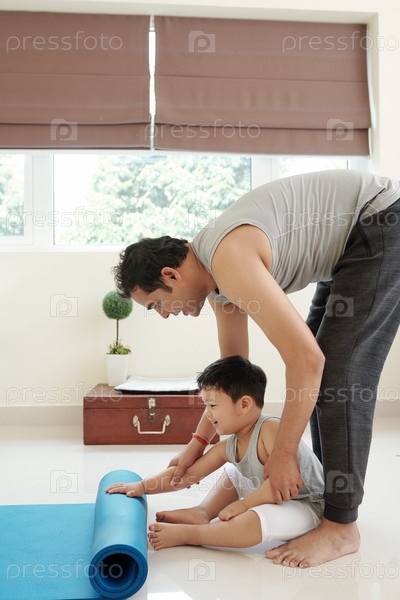 Отец и сын разворачивают коврик для йоги