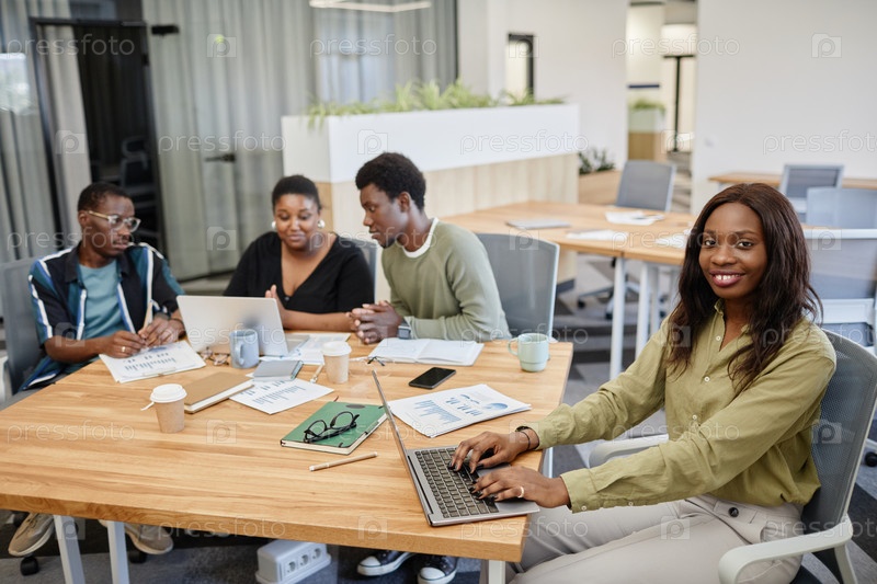 Черная бизнесвумен, печатающая на ноутбуке