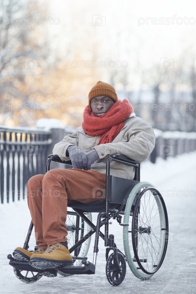 Инвалидный афроамериканский мужчина на улице зимой