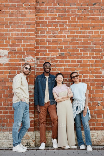 Разнообразная группа людей на кирпичной стене