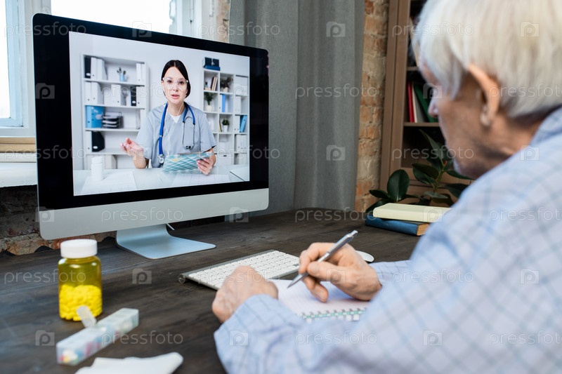 Больной пожилой человек записывает советы врача, сидя перед компьютером
