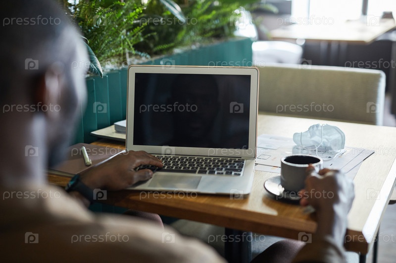 Африканский американец использует ноутбук за столом в кафе