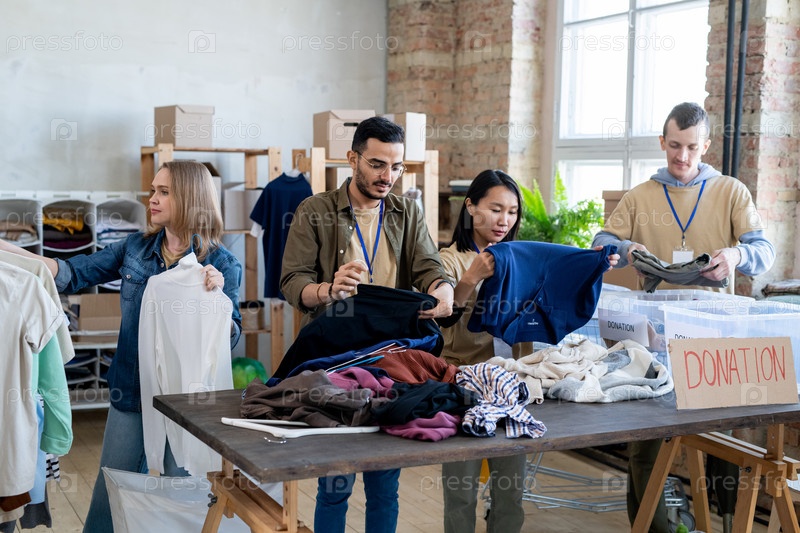 Межкультурные люди выбирают одежду для пожертвований