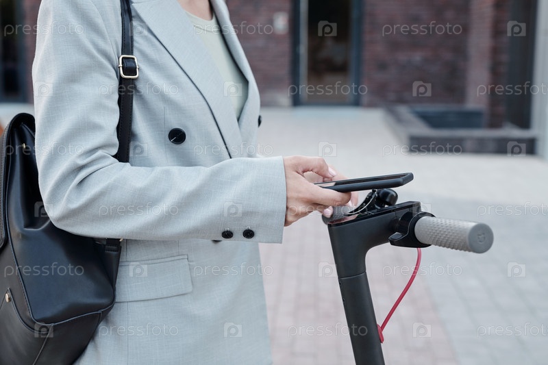 Деловая женщина со смартфоном, использующая мобильное приложение для аренды скутера