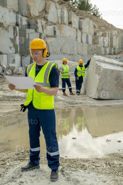 Молодой строитель с эскизом стоит против двух коллег