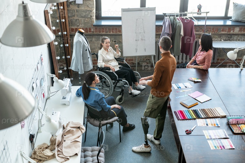 Молодая женщина-дизайнер отключается на доске и другие коллеги слушают уверенного в себе мужчину
