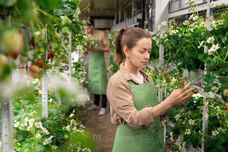 Человек в фартуке, работающий в саду против молодого фермера