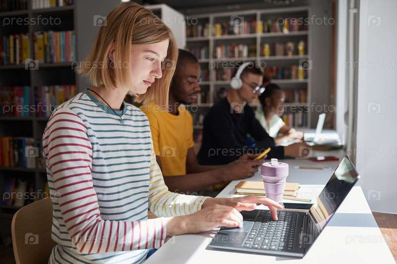 Молодая женщина использует ноутбук в библиотеке