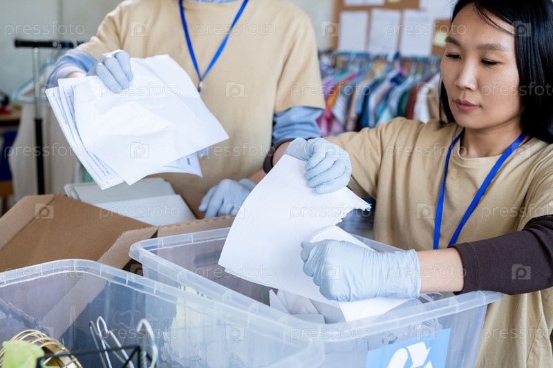 Женщины-добровольцы в перчатках рвут бумагу над пластиковыми контейнерами