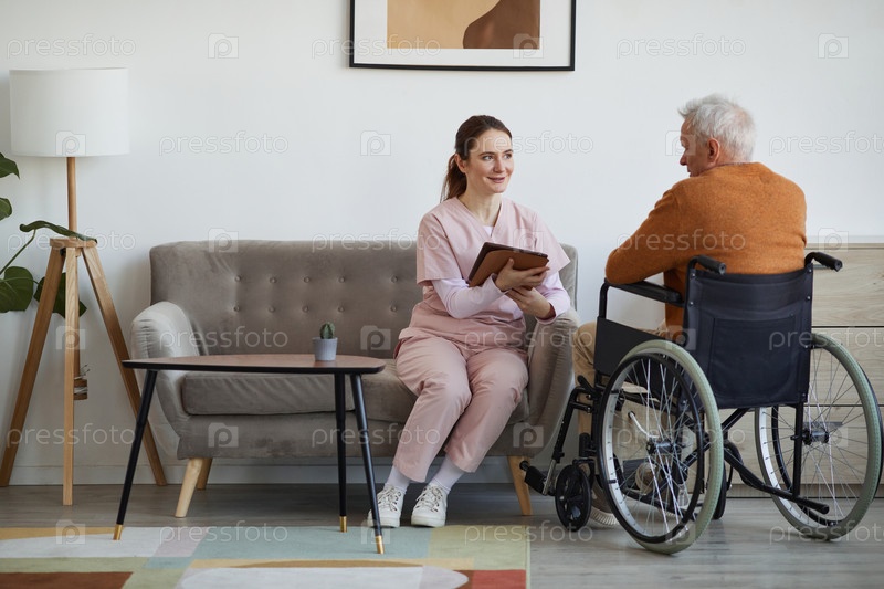 Улыбающаяся медсестра обследует пожилого человека-инвалида